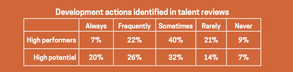 This is a meaningful and consequential finding that reflects the very poor state of “high talent” development in organizations. It suggests that most development actions are “random” or generic activities like high potential development cohorts, rather than thoughtful and consequential experiences that will accelerate an individual’s growth.