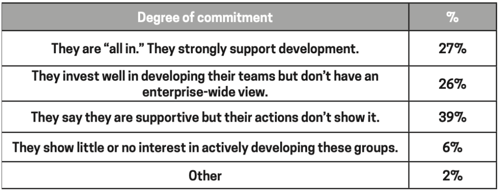 There’s good and bad news in this data with 53% of respondents saying that their top team either strongly supports high talent development, or at least invests in their own teams. Another 39% of respondents say their top team members talk a good game but are short on results.